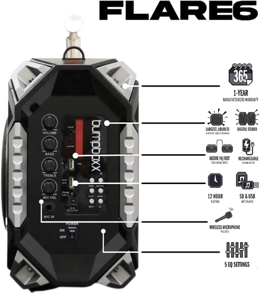 Bluetooth Boombox Flare6 Black | Retro Boombox with Bluetooth Speaker | Includes Rechargeable Lithium Battery, Carrying Strap & Remote | Quality Loud Sound with Bass